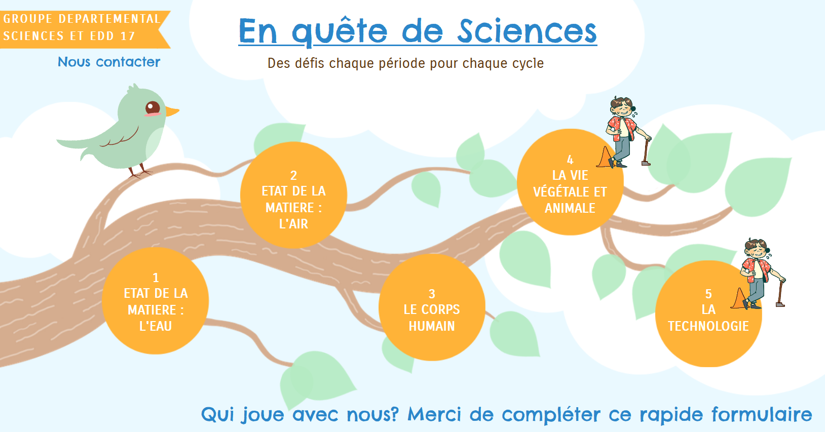 Le groupe départemental sciences & EDD de Charente-Maritime, vous propose plusieurs défis ou enquêtes dont l’objectif est de fournir aux enseignantes et aux enseignants un moyen de couvrir l’ensemble des thématiques des programmes scolaires des cycles 1, 2 et 3.