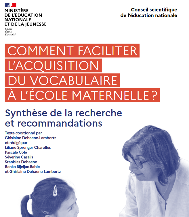 Publié 5 octobre 2023 Par le Conseil Scientifique de l’Éducation Nationale : Comment faciliter l’acquisition du vocabulaire à l’école maternelle ? Pour accéder au document : https://www.reseau-canope.fr/conseil-scientifique-de-leducation-nationale-site-officiel/outils-pedagogiques/syntheses-et-recommandations.html