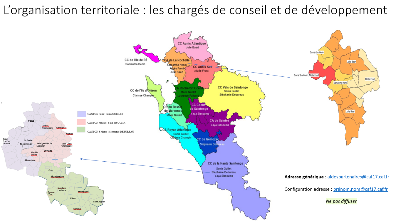 La carte N°1 synthétise le découpage territorial et précise le correspondant C.A.F. associé.