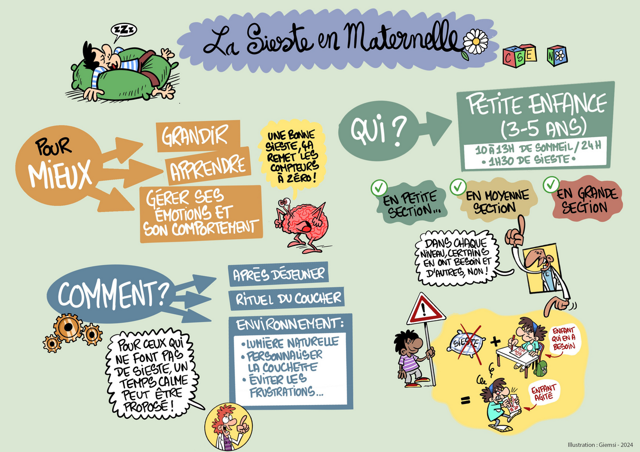 Le temps d’endormissement variant selon les enfants, il est généralement conseillé de lever ceux qui ne dorment pas après 20 minutes, à condition qu’ils soient arrivés à la couchette déjà calmes et prêts à dormir. Il n’est pas nécessaire d’avoir un temps de récréation avant, ni même après la sieste.”