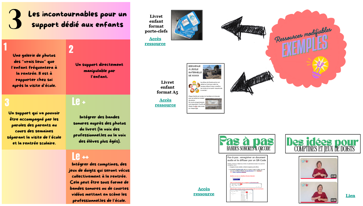 Nous mettons à votre disposition une infographie en quatre pages qui vous permettra de réaliser des choix selon votre contexte d’exercice. Plusieurs exemples de livrets pour les familles et de livrets pour les enfants sont accessibles dans ce document. Nous vous conseillons de télécharger directement ces ressources sur vos ordinateurs afin de pouvoir les transformer à votre guise ensuite. Vous pouvez consulter l’infographie à partir du visuel ci-dessous ou avec le lien suivant : https://nuage03.apps.education.fr/index.php/s/x9tow3fdFfcJ6bG