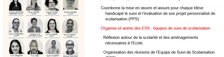 Accompagnement des équipes : écoute, conseils, visites d’enseignants/ d’élèves en lien avec les circonscriptions et formations : Formation initiale et continue des enseignants spécialisés Accompagnement au CAPPEI Formation initiale et continue des AESH (Accompagnants des élèves en situation de handicap) formations intercatégorielles Formations dans les écoles/établissements scolaires (Conception Universelle des…