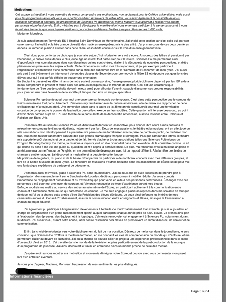 Jeanne Champeau qui est venu il y a 15 jours nous présenter la vie sur le campus Sciences Po Paris nous met à disposition 3 exemples de lettres réalisées par des candidats au campus de Reims.