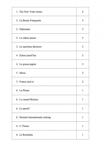 Aprés dépouillement des votes du jury , voici le classement des Unes. Ne figurent ici que celles qui ont obtenu des points. Des Unes de bonne qualité n’ont pas été récompensées. Au total, 40 points ont été attribués. La dispersion des points a été importante cette année avec de grandes différences dans les appréciations des membres du jury.