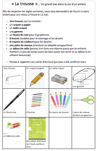 Les enfants accueillis doivent venir à l’école le premier jour de leur reprise avec une trousse complète.
