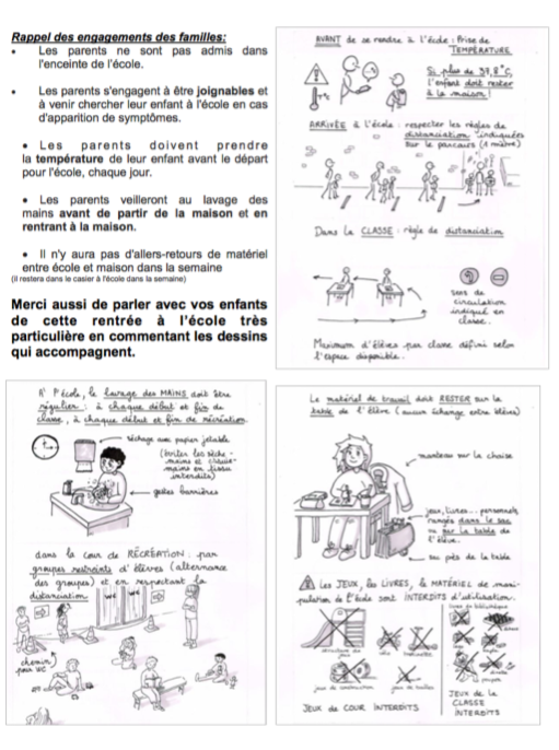 Les adultes accompagnateurs devront porter un masque et se désinfecter les mains à l’entrée de l’école. Ils devront conduire leur enfant à la salle d’eau pour qu’il se lave les mains puis l’emmener dans sa classe.