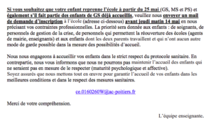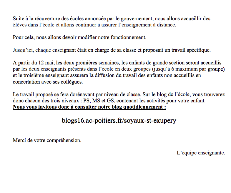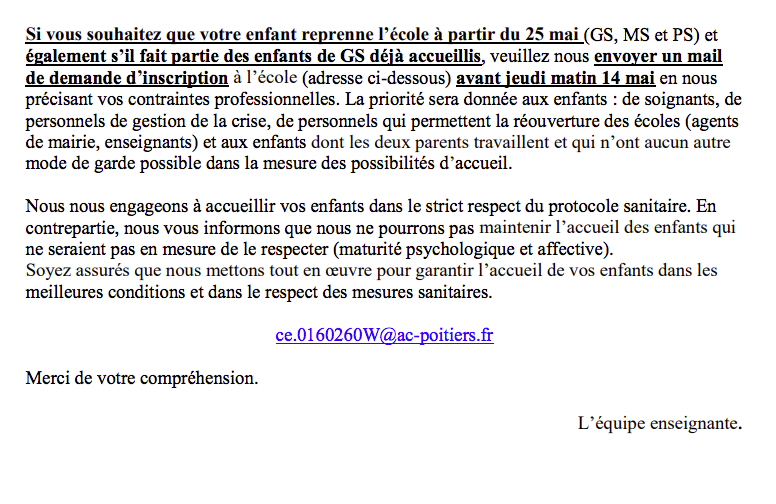 Le 25 mai, nous avons étendu l’accueil à d’autres enfants de grande section et également à des enfants de moyenne et de petite section mais le protocole sanitaire ne permet pas d’accueillir tous les enfants en même temps. Nos capacités d’accueil sont très limitées et nous avons établi des critères de priorité afin de planifier l’accueil des enfants. Vous trouverez en annexe 1 un courrier de Monsieur Porte, Inspecteur de l’Education Nationale circonscription Angoulême Est, adressé aux familles.