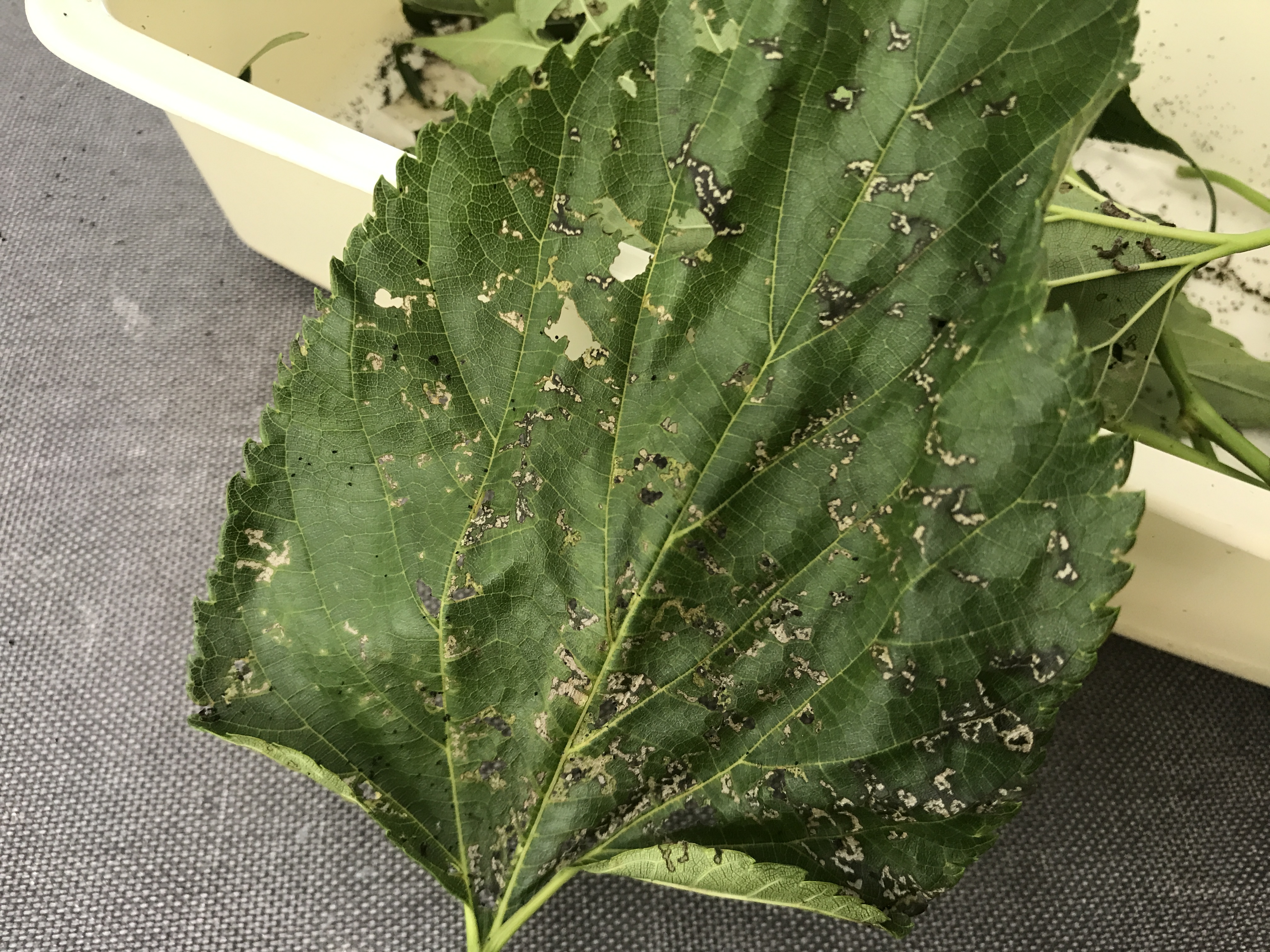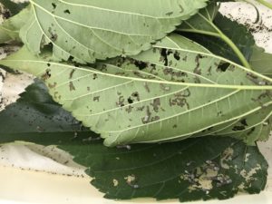voici une feuille après le passage des chenilles du deuxième âge (observez les trous et la dentelle. Au passage, regardez aussi comme la feuille se défend en noircissant les zones attaquées) :