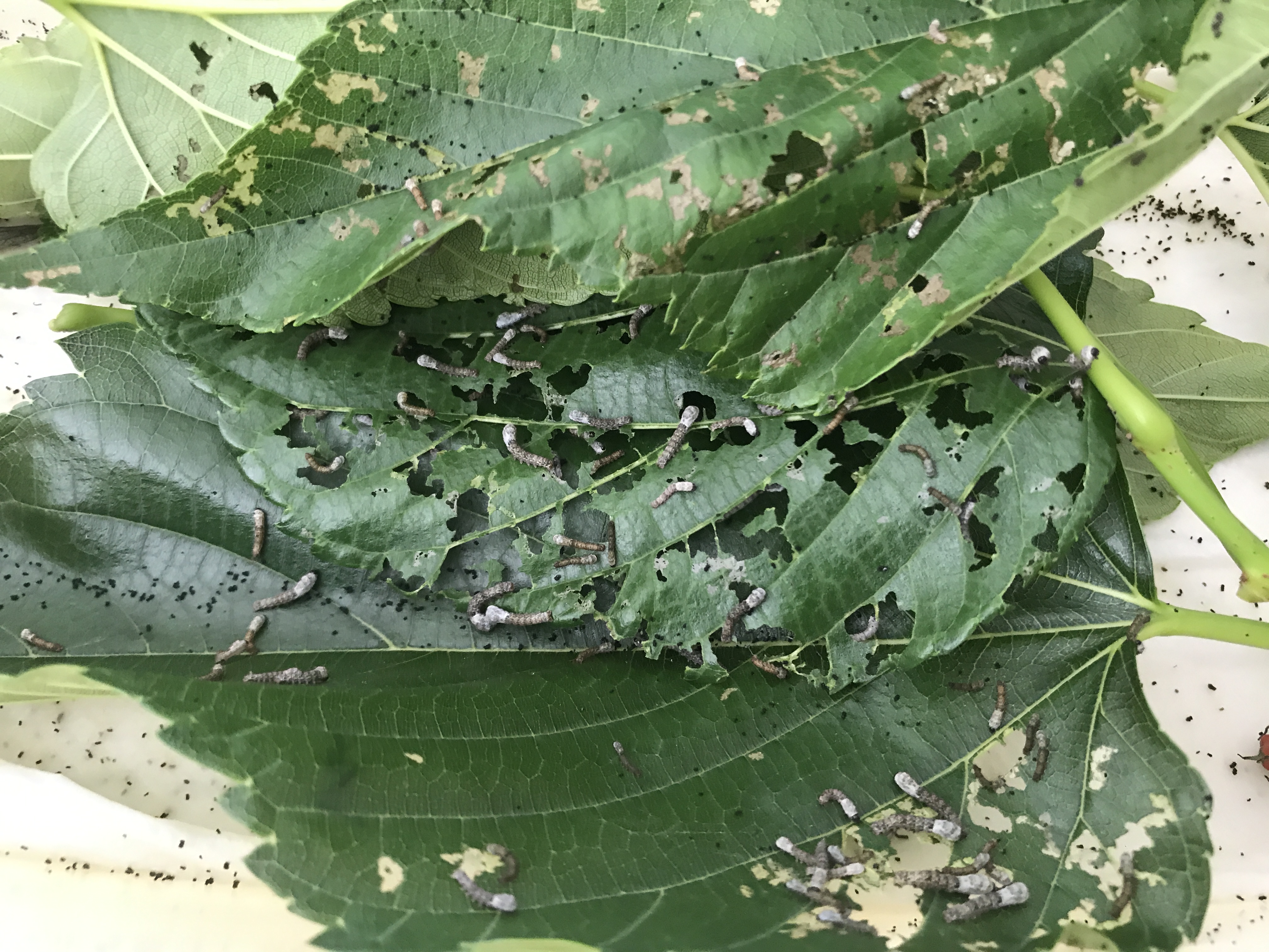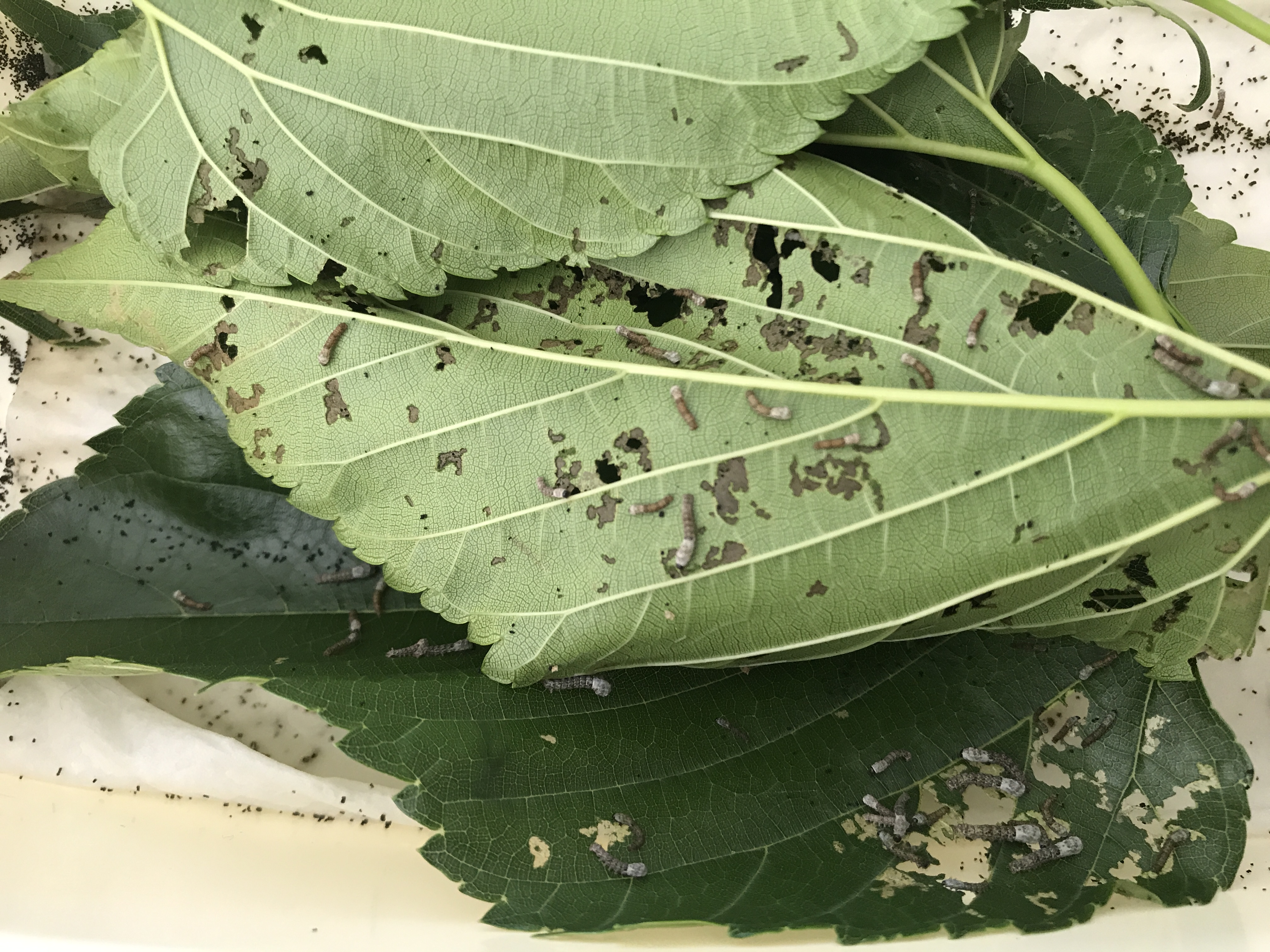 Les chenilles ont mué deux fois, elles arrivent au troisième âge et elles mesurent maintenant 1cm. Il est plus facile de les toucher. Elles commencent à faire de vrais trous dans les feuilles. On commence même à les entendre manger si on tend bien l’oreille et qu’il n’y a pas de bruit dans la pièce.
