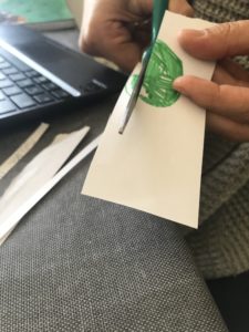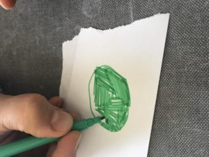 Les parents prépareront un vert en mélangeant du bleu et du jaune ou en mettant un vert mais en rajoutant un peu de jaune et en ne mélangeant pas trop bien pour que l’on vois ressortir des nuances de vert.