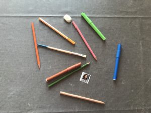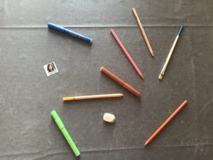 l’enfant nomme : un crayon orange, un crayon rose, un crayon vert, un feutre bleu, un feutre vert, un feutre marron, un stylo orange, un pinceau, une gomme, un crayon à papier, une photo