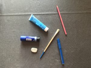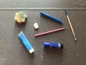 une éponge, un feutre bleu, un crayon rose, de la colle, un pinceau, de la peinture bleue, une gomme