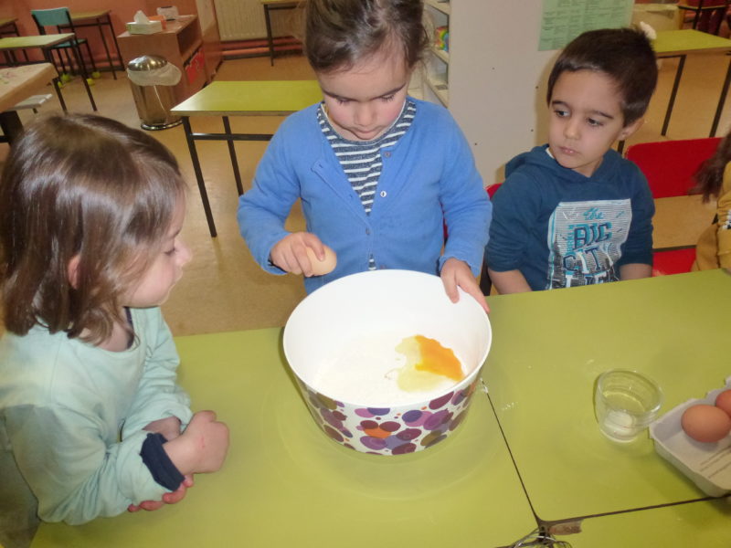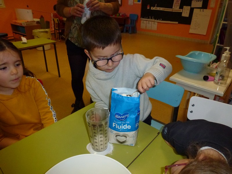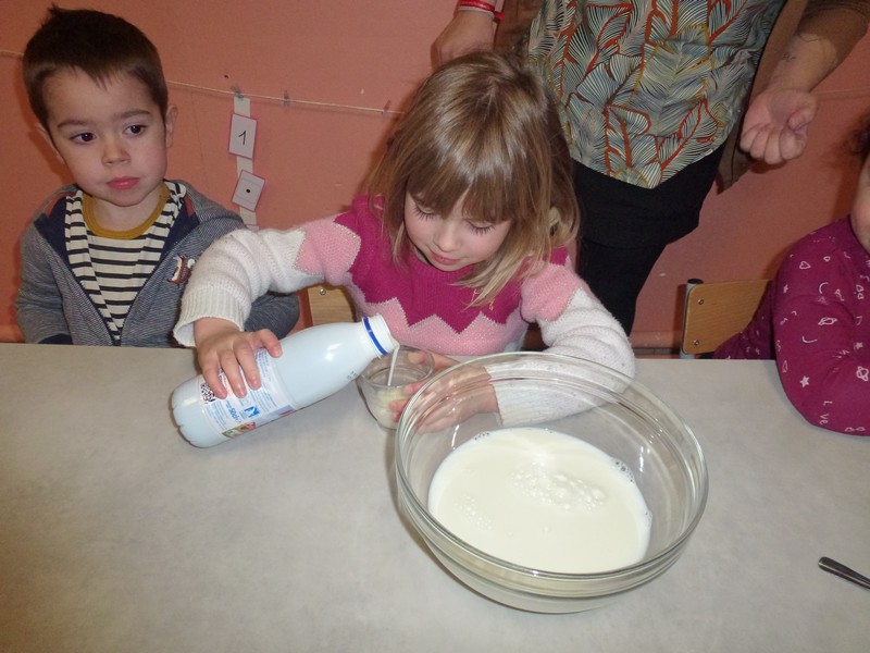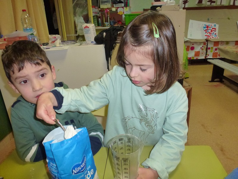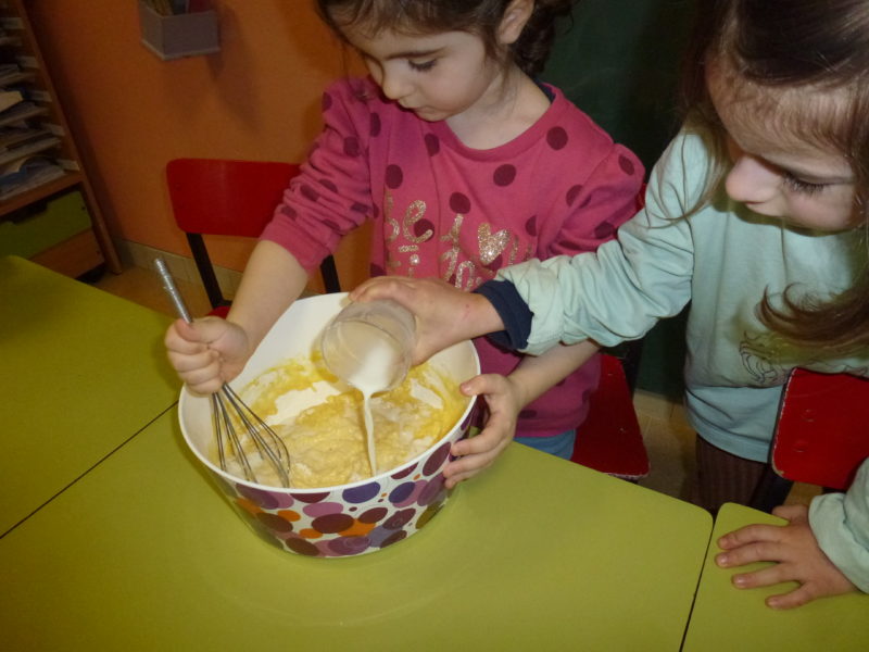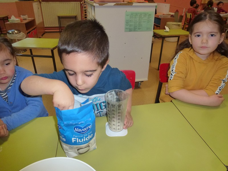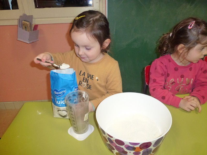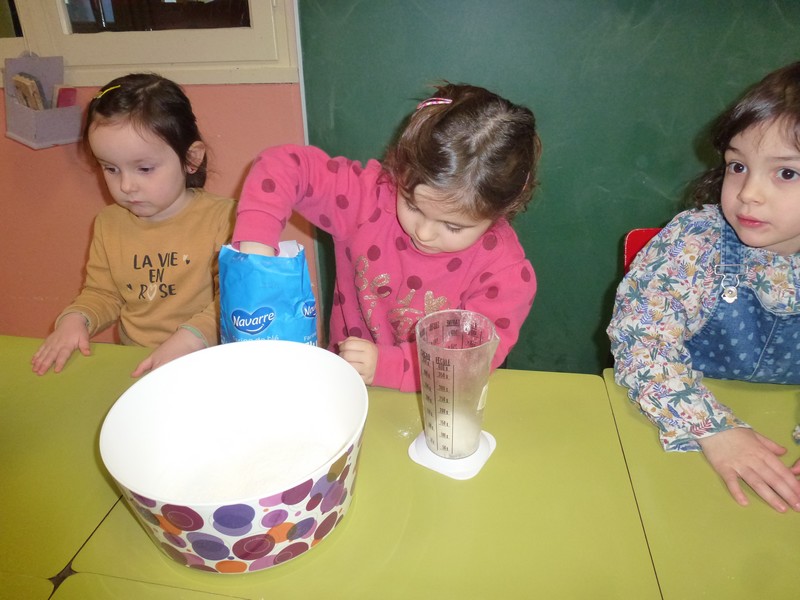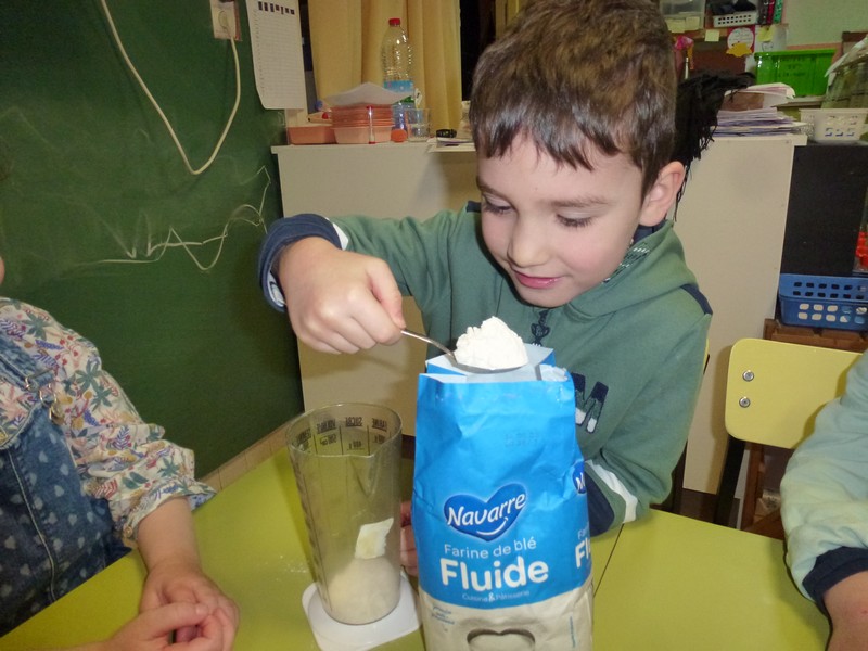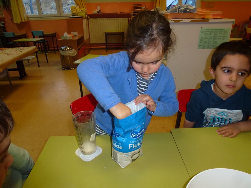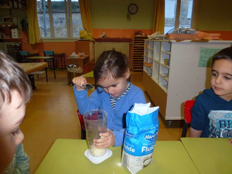 Nous mesuré la quantité de farine et de lait qu’il fallait puis nous les avons mis dans le saladier avec les oeufs et le sucre vanillé.