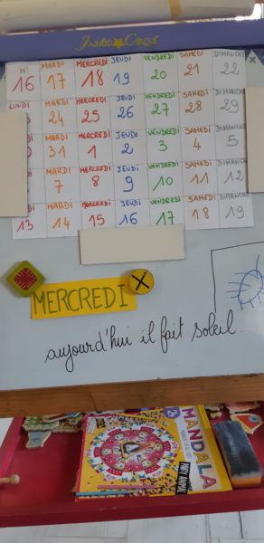 Mérine poursuit nos rituels du matin à la maison (jour, mois, date…).