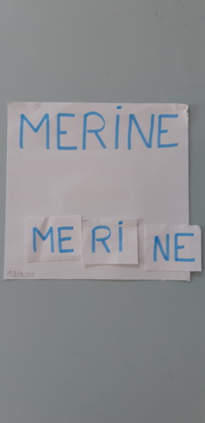Remise en ordre des lettres de son prénom. Je vous conseille de réaliser ce travail lettre à lettre en commençant par l’initiale.