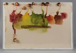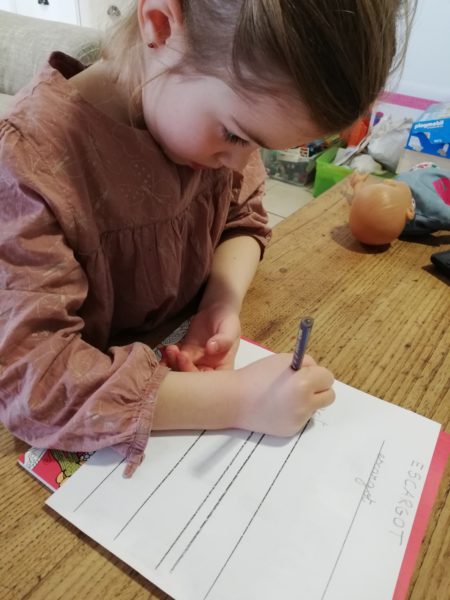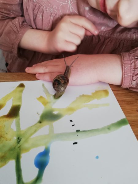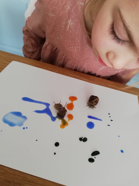 Elle a fabriqué une escargotière, elle a écrit “escargot” et “coquille” et elle a peint avec les escargots comme Claude Gilli (ce sont des colorants alimentaires avec de l’eau, aucun escargot n’a été maltraité!).