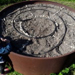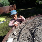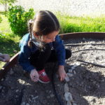 -jardinage: nous avons fait un soleil avec des pierres puis nous avons semé des fleurs dans le rond et des radis dans deux rayons, des carottes et des pois de senteur.
