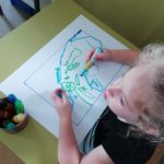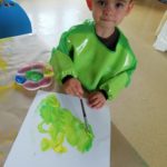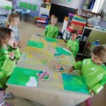 Nous avons mélangé de la peinture bleue et de la peinture jaune.