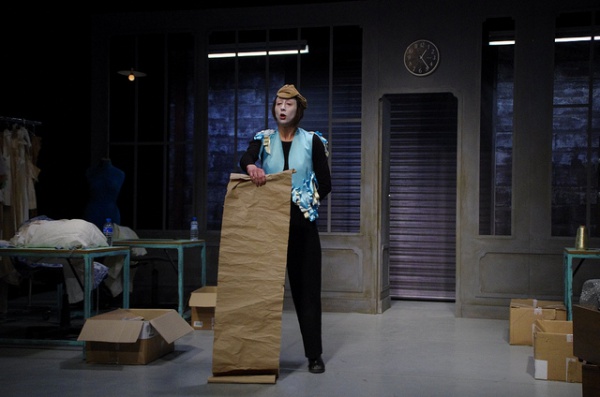 J’ai aussi trouvé la fin triste et touchante. C’est le son (les sirènes) qui est mis en valeur. L’éclairage est très faible donc on ne voit que très peu l’ouvrière qui continue à jouer le rôle d’Harpagon. Assise sur un carton, elle crie son texte et forcément elle n’entend pas ses collègues l’appeler. Elles lui hurlent de s’arrêter car la police arrive, mais la couturière, qu’on dirait possédée par son personnage, n’entend rien.