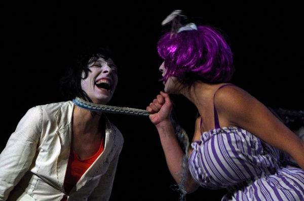 L’Avare de et d’après Molière, Compagnie Haute Tension, avec Fanny Chabanne (La Flèche), Marie-Claire Vilard (Harpagon), Martine Fontanille (Elise) © Vincent Dubois