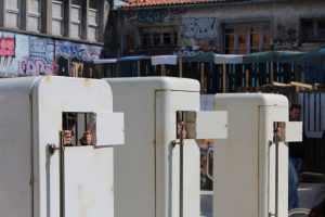 Dans Dix mille pas sans amour, le passage que nous avons retenu de ce spectacle de rue que nous avons regardé dans la cour est le passage du serment des trois femmes avec les poussins. Elles sont venues chercher des filles et des professeurs à qui elles ont donné des petits poussins en peluche pour représenter la douceur des femmes. Puis elles se sont regroupés au centre de la cour devant les frigos et ont dit un serment. Les comédiennes ont aussi fait une chorégraphie qu’elles referont plusieurs fois dans le spectacle. Les femmes établissent ce serment pour abolir la fin des guerres entre les hommes. Ce serment consiste à ne plus avoir de relations sexuelles avec leurs maris ou avec leurs compagnons jusqu’à ce qu’ils arrêtent de se battre entre eux et de s’entretuer. Pour elles aussi c’était très difficiles car elles aiment leurs compagnons. Pendant le serment les femmes montent sur leurs frigos et font le serment (enchaînements de gestes). Ces enchaînements de gestes consistaient à mettre les mains sur les épaules en croisant les bras tout en disant “Ah ! ” à plusieurs reprises. Puis après elles décroisaient leurs mains en mettant les paumes vers le ciel toujours en disant ” Ah ! “.